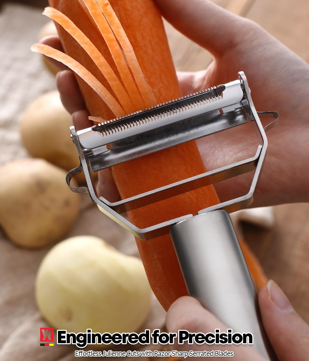 ⏱ Speeds Up Prep Time – Switch blades instantly to peel, slice, or julienne in seconds—perfect for quick meals.