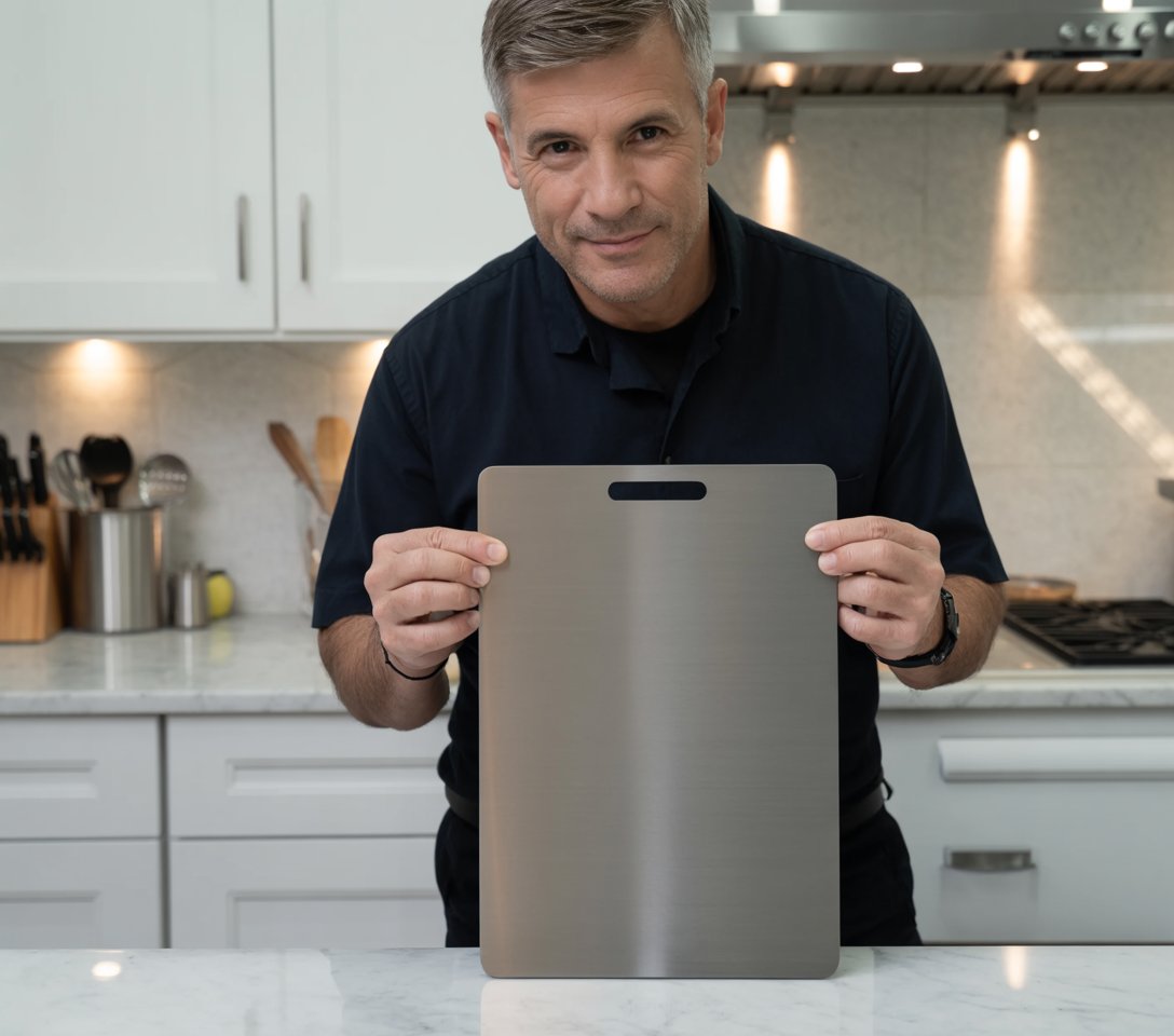 I meal prep every week. As someone who cooks regularly, I need my kitchen to be clean and my knives to stay sharp and this cutting board is perfect for that. The steel surface is really sanitary, and I don’t have to worry about harmful chemicals or particles. I used to use wooden boards, but they would get grooves that harbored bacteria, which was a nightmare. Unlike other boards, it doesn’t dull my knives, and it’s really easy to clean. It’s made my kitchen routine much smoother!