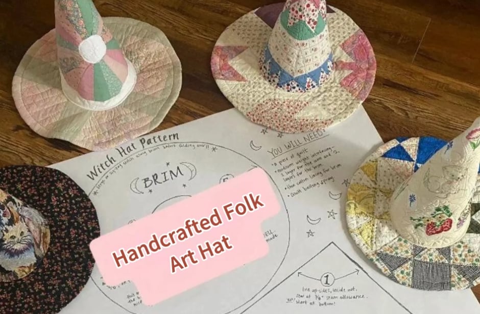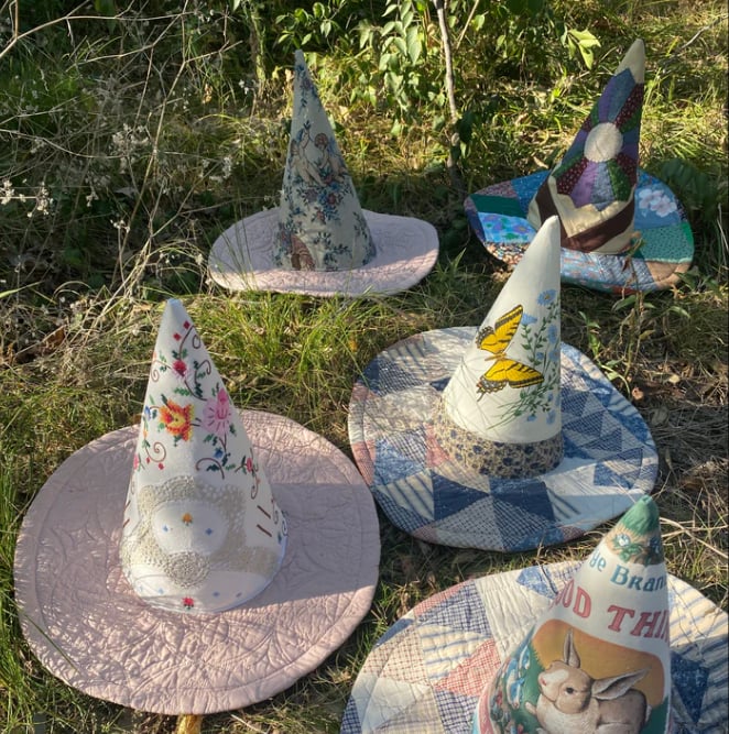 I carefully select vintage quilts—each with its own past—and transform them into unique witch hats brimming with rustic charm. No two hats are alike, just like the stories they carry.