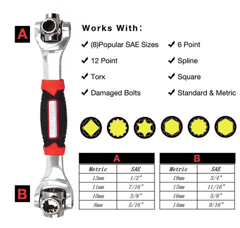 The uniquely designed 52-in-1 socket wrench that instantly becomes the right tool for any job by simply clicking between the different sizes! You don’t need multiple socket wrenches or large tool kits, just swivel the head to find the right fit! The Tiger Wrench changes from one size to the next as fast as you can click the tool! The unique revolutionary tooth design allows you to do both standard and metric sizes- simply flip the tool around and you have more sizes! Unlike other wrenches, Tiger Wrench lets you work at a 45° angles! The Tiger Wrench is handy, convenient & saves you time! Tackle projects around the house, on the road, on the job, anywhere! This professional-grade tool is designed with 360° rotating head that quickly changes to the size you need. No more struggling to find the right-size socket head! No more lugging around heavy tool boxes. With this one wrench, take the guesswork out of your projects and make them faster & easier!